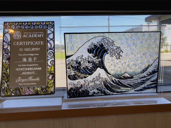 関市の刃物メーカーのひとつ、義春刃物から生まれた、彫刻刀でつくるアートがシャインカービング。オーナーのタカダはノービス検定を受け合格した、その界隈をにぎわした実力の持ち主でもある。