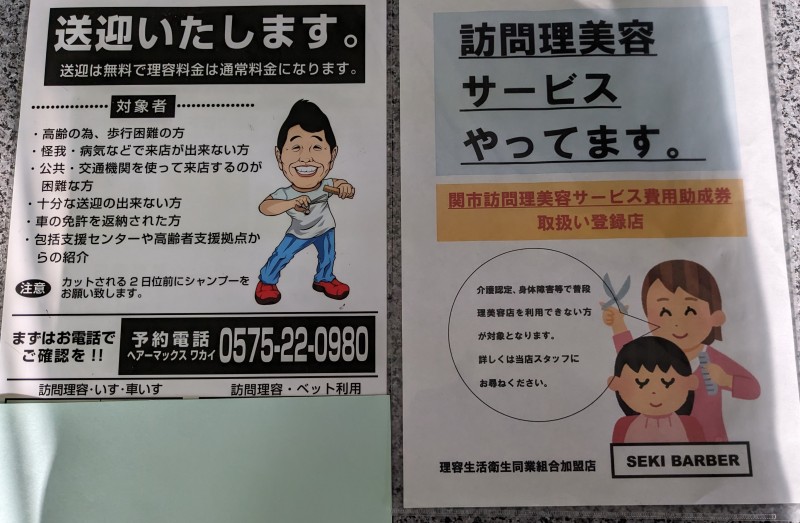 平日限定ですが出張理容、全日有効送迎理容やっています。詳しくは☎0575-22-0980まで