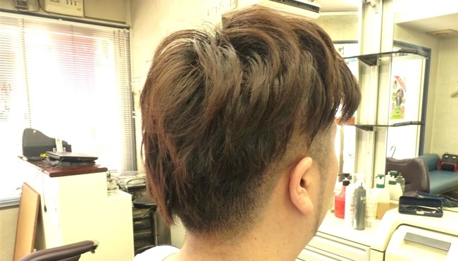 2mmのバリカンをベースにしたツーブロックカット。バックの刈り上げは上を取りすぎないように「えぐり刈り上げ」を施して、上部の髪の毛が少しかぶる程度にしています。